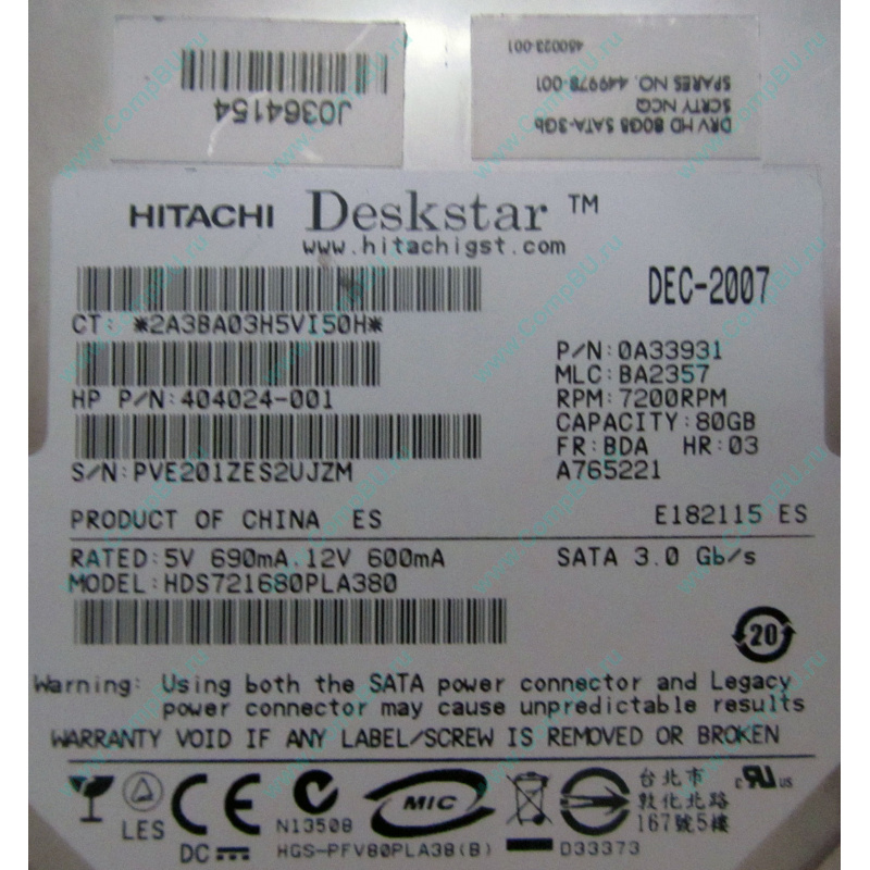 Б/У жёсткий диск 80Gb Hitachi Deskstar HDS721680PLA380 (80 гигабайт, 7200 rpm) SATA (HP part no. 404024-001, spare no. 449978-001). Можно устанавливать не только в компьютеры HP.
